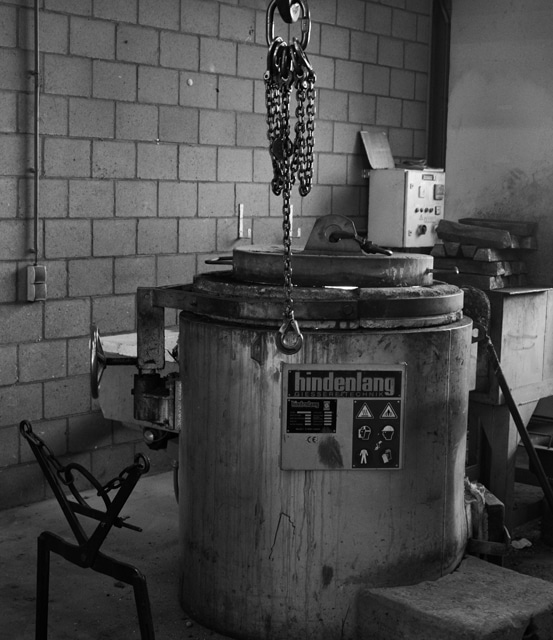 Cire Perdue Methode (Verloren Was Methode):: Deze traditionele techniek begint met een model van klei (plasticine) van de sculptuur, waarover een siliconenmal wordt gemaakt in de Kemner bronsgieterij. Zodra de mal is uitgehard, wordt vloeibare was in de mal gegoten om een exacte replica van de sculptuur te vormen. Vervolgens wordt een gipsen mal over het wasmodel aangebracht, die in een oven wordt gebakken om de was te verwijderen en het gips te verharden.
