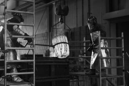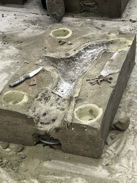 Gesmolten brons wordt in de verhitte mal gegoten, waardoor de was wordt vervangen. Na het afkoelen wordt het gips verwijderd, waardoor de bronzen sculptuur zichtbaar wordt, die vervolgens wordt verfijnd door slijpen, polijsten en inwassen om de gewenste afwerking te bereiken.