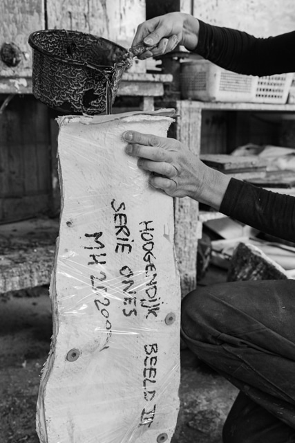 Zandgiet methode: Voor grotere sculpturen, zoals "The Ones I," begint Hoogendijk met een digitaal model van haar sculptuur, gemaakt door 3D-ontwerper Patrick Beverloo. Met behulp van dit digitale model worden secties van de sculptuur uit piepschuim gefreesd, geassembleerd en bedekt met gips om details toe te voegen. Deze secties worden ingebed in een zandmal, gevormd door zand te mengen met hars en activator. Na uitharding wordt de mal gesplitst, en brons wordt in de holte gegoten die door het verwijderde piepschuim is gecreëerd. Nadat het brons is afgekoeld, wordt het zand verwijderd, en de bronzen stukken worden aan elkaar gelast, verfijnd en behandeld met een donkerbruine was om het uiteindelijke uiterlijk te bereiken.